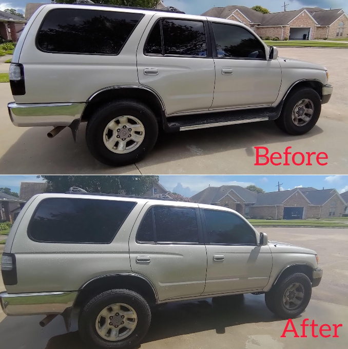 Picked up where I left off yesterday with the stripe removal. I used the eraser wheel to get the bulk of the sticker off, leaving a thin line of dirt where the top edge of the decal was. Polishing seemed to help get it off, so I just cycled through eraser wheel and buffing until it was all gone. Slight ghosting at the right angle and light but that was expected since these have been here for 23 years. I also decided to take off the emblems on the lift gate, I did the "SR5" and "Toyota" first... plastic pry tool, scraped off excess tape, eraser wheel, then buff and polish. Ghosting was pretty bad so I left the larger "4Runner" emblem alone.